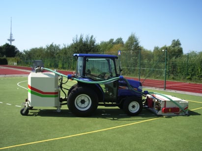 Der Kunstrasenreiniger besteht aus einem Reinigungsvorsatz im Frontanbau und einer Behälter-Pumpen-Einheit im Heckanbau.